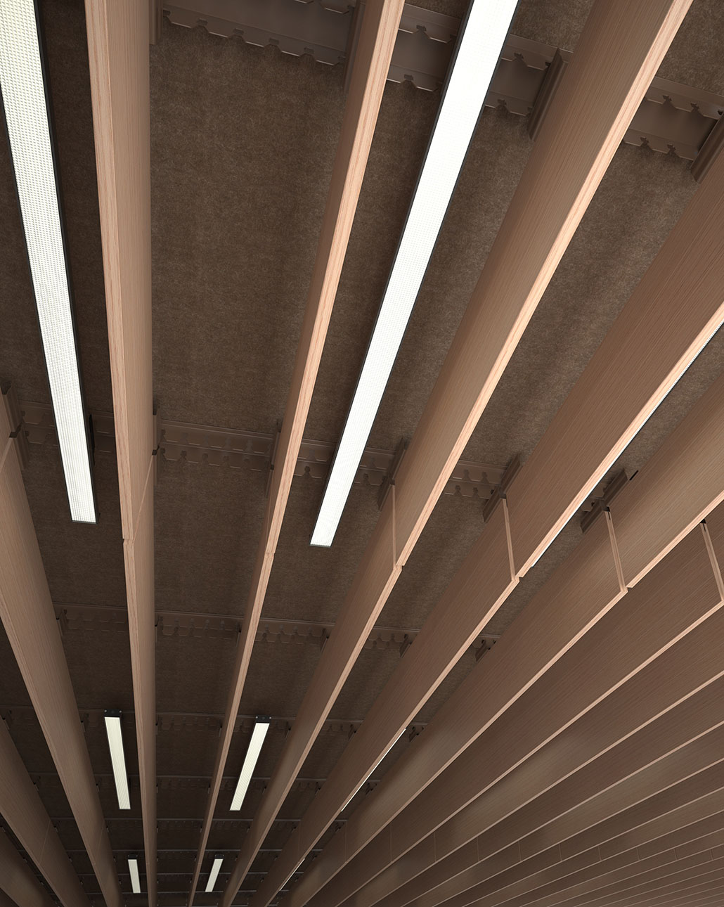 Design refined and exclusive baffle or grill ceilings with Blayde – a premium system where every detail reflects craftsmanship and precision. Each Blayde is veneered on both sides and finished with solid wood lippings on all three visible edges, ensuring a harmonious and authentic wooden appearance from every angle. The Capax Quick-Up installation system provides secure, time-efficient, and fully demountable mounting with flexible spacing configurations. Blayde naturally meets up to the highest A2-s1,d0 fire classification and can be tailored with different veneers, pigmented colours, or Gustafs’ acoustic perforation Nano. Available in depths from 130 to 400 mm, Blayde is fully compatible with the Capax Mix system.
