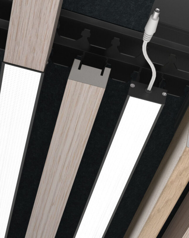 Easily attach linear LED lamps to the Capax installation profile using the U-FIX-F clip, which also supports the Feltfon Linear Ribs. The F-Line Click LED lamps align perfectly with 50 mm deep Feltfon Linear Ribs or can be discreetly positioned between Feltfon Linear Baffles. Can also be perfectly alined with 40 mm wide Gustafs Linear Ribs, using the Mix system installation.