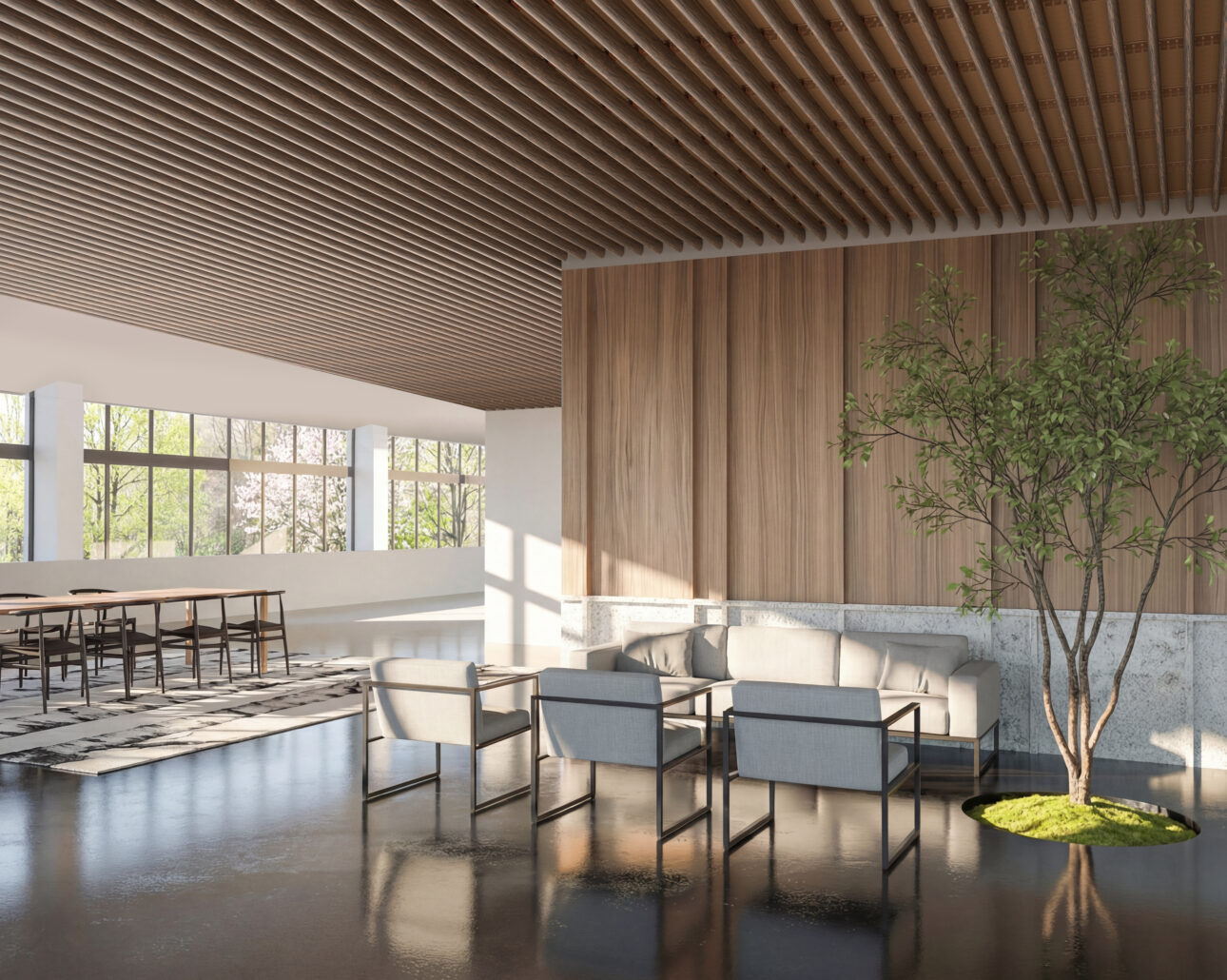 Like all solutions within the Gustafs Linear family, Rib-E is installed using the Capax Quick-Up system, ensuring a precise, efficient and secure assembly. You control the visual identity: choose veneer, surface finish, spacing colour, dimensions and centre-to-centre distances.