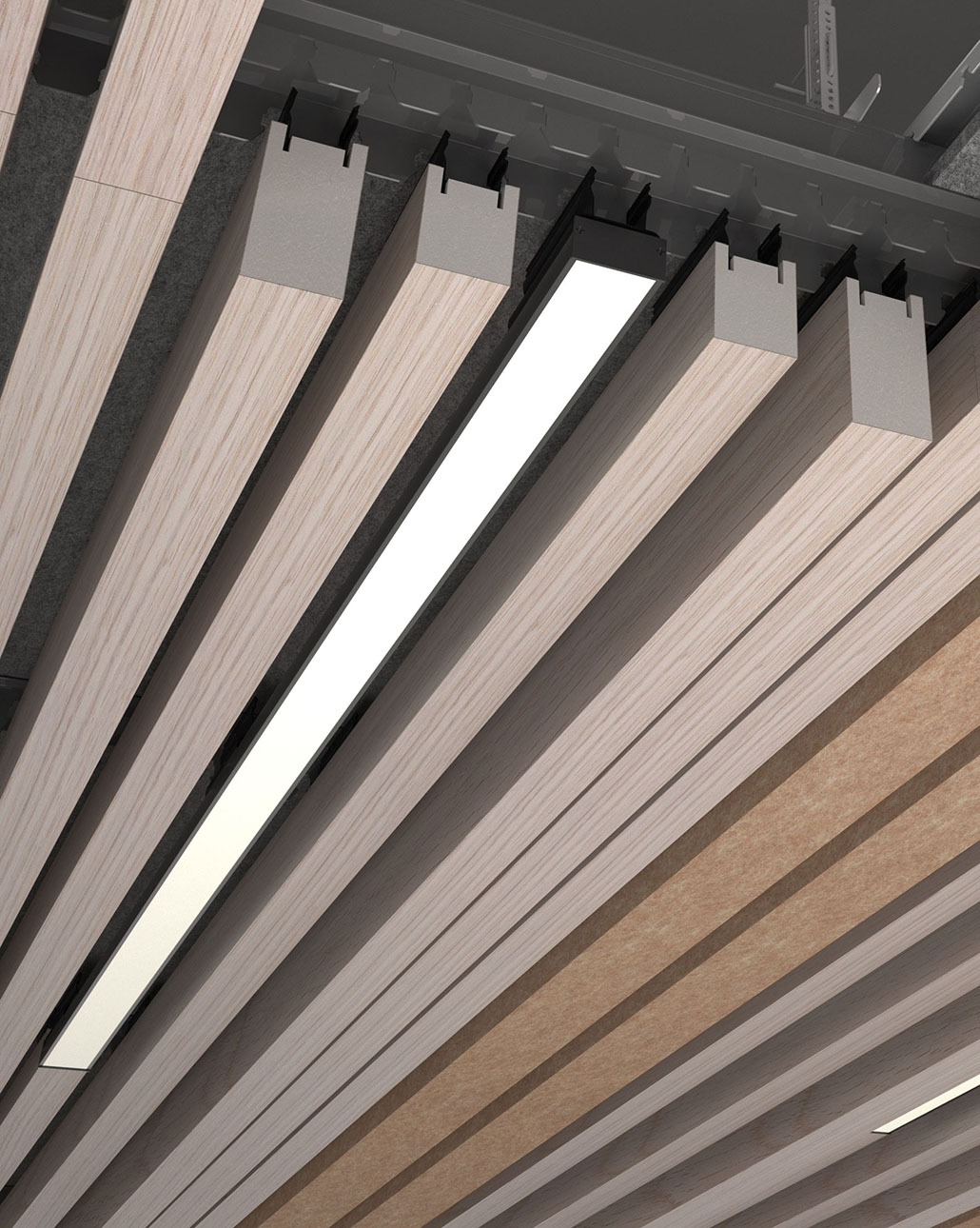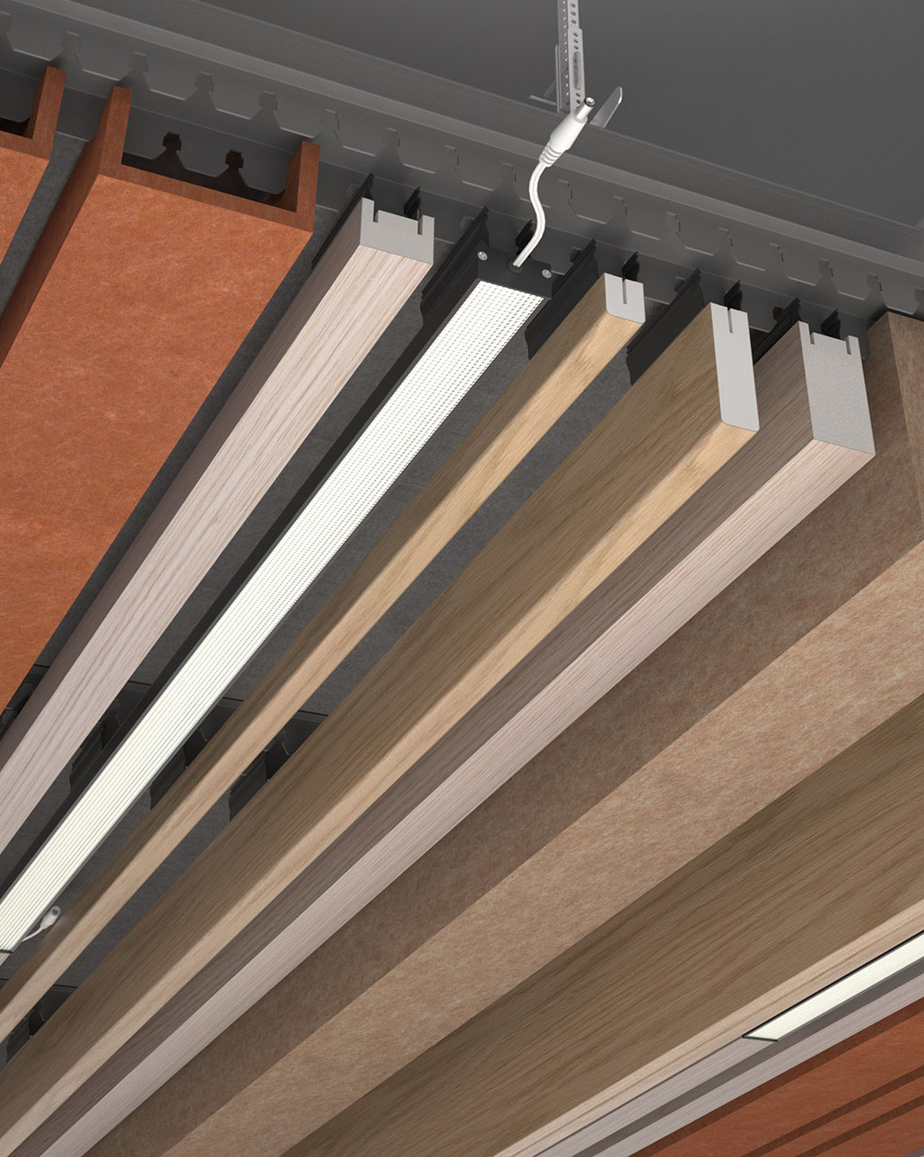 Combine Gustafs Linear Rib Narrow with other products using the same installation system, Capax Mix. Gustafs Linear Rib, Feltfon, Blayde and integrated LED lighting, F-Line-C and F-Line-R. This versatility opens up entirely new creative possibilities, allowing you to design custom, one-of-a-kind expressions with seamless fit and perfect visual alignment – every time.