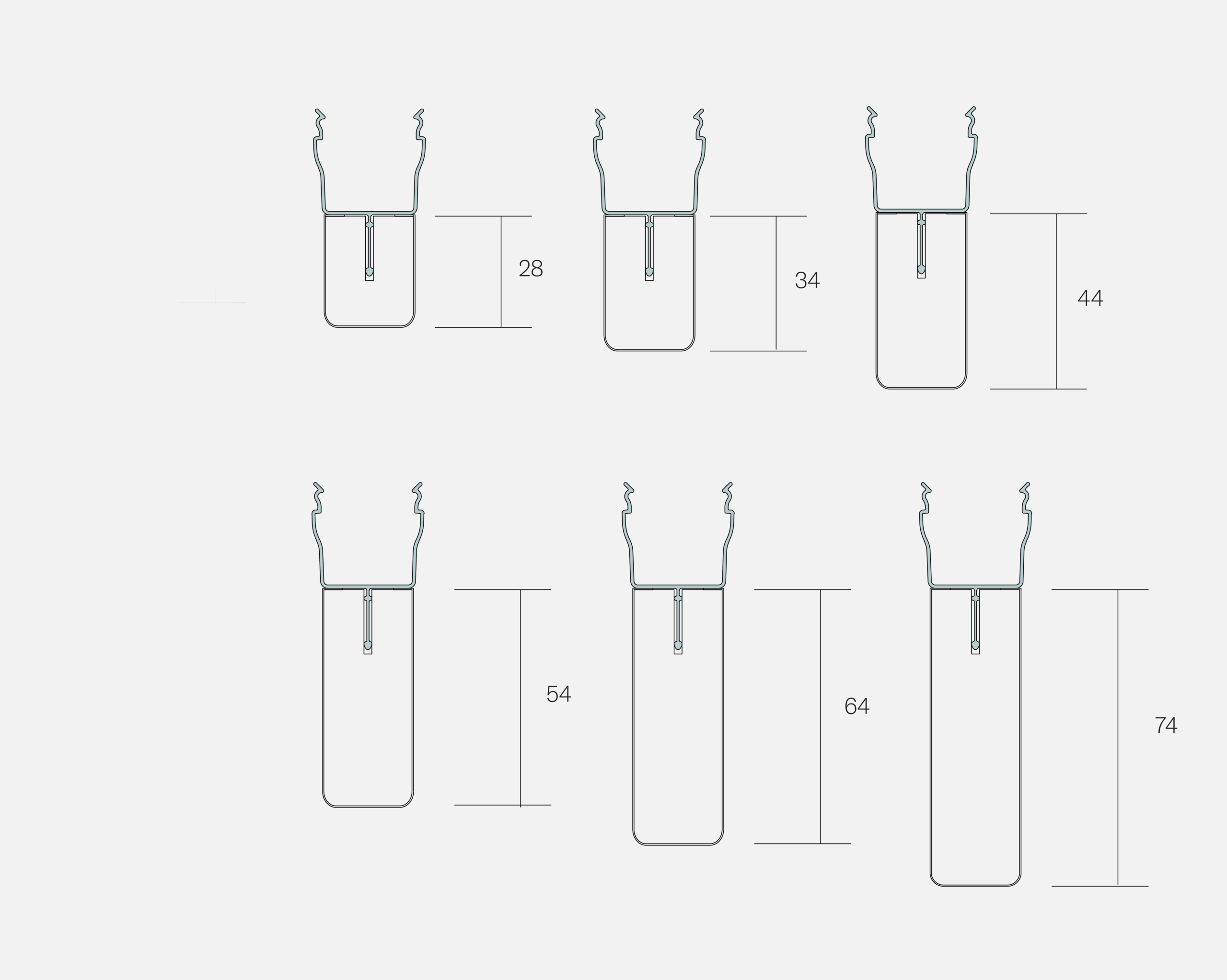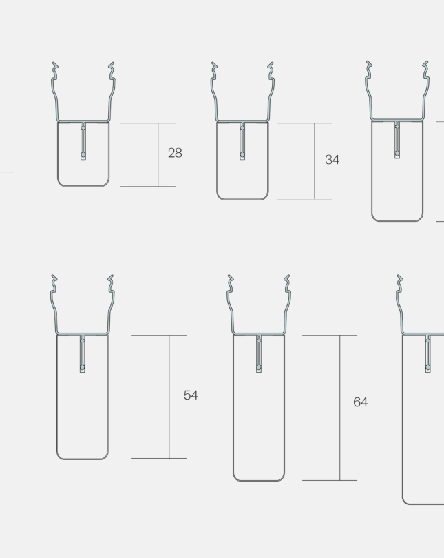 Within the Capax Mix system, the centre-to-centre (cc) measurements are fixed at 62, 93, 124, 155, and 186 mm. The resulting visible spacing between profiles depends on the selected product width and configuration.