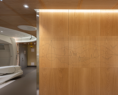 At the centre of the restaurant is the cylindrical kitchen. The circular kitchen section is clad in a light ash panel which, in contrast to the rich colours, creates a balance in the room. The panel wall consists of our Linear Plank installed with an open joint where the joint has been installed with an ash infill strip.