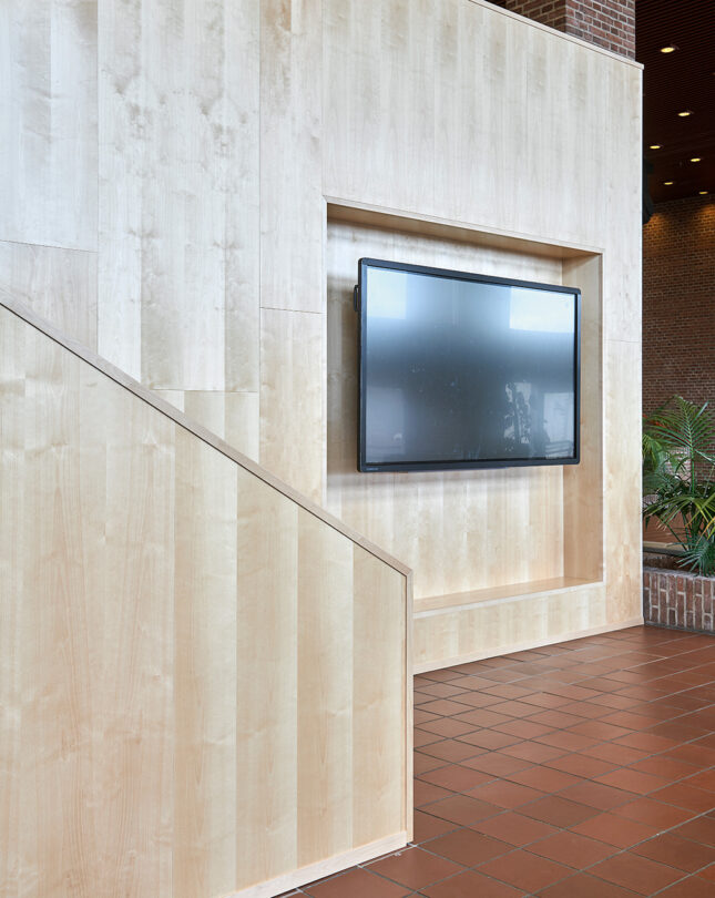JJI supplied Gustafs panel cladding for walls and ceilings in the common room and library, using plain panels in birch veneer.