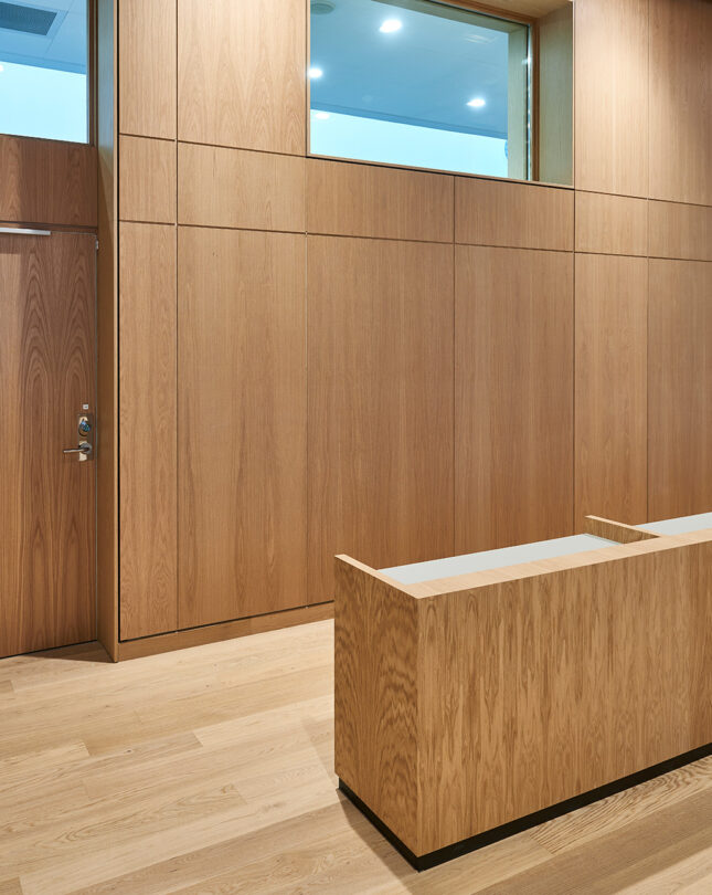 Each of the building’s twenty courtrooms features a wall clad with Gustafs panels, supplied by our Danish distributor JJI. The acoustics are optimized by combining plain panels with nano-perforated panels, all finished in oak veneer.