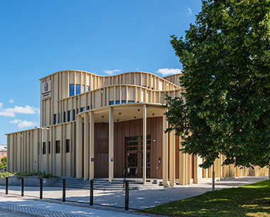 In the main atrium of the building, our Linear Ribs dress the outside of the mezzanine levels as well as the inside of the stair cores. Ribs in different widths were used, all in walnut veneer.