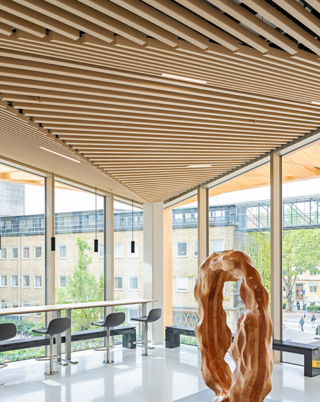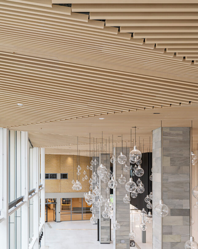 Wood has been incorporated into the interior in various forms to create a warm and relaxing environment, and in the building’s main entrance, a 750 square metre faceted ribbed ceiling spreads out, consisting of Gustafs Linear Ribs in ash veneer. It’s an impressive installation where all angles and slopes have been calculated with millimetre precision. The ceiling has integrated lighting fixtures and is fully demountable, which simplifies maintenance work.