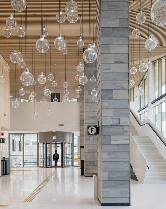 Hanging from the ceiling are 164 hand-blown glass globes, which further contribute to the warm and inviting feel of the entrance. This is the artwork Spaces of Light by Runo Lagomarsino, and each globe represents a person who works at the hospital and the place they come from. The globes each glow with varying intensity at different times of day, depending on the position of the sun at the place they represent.