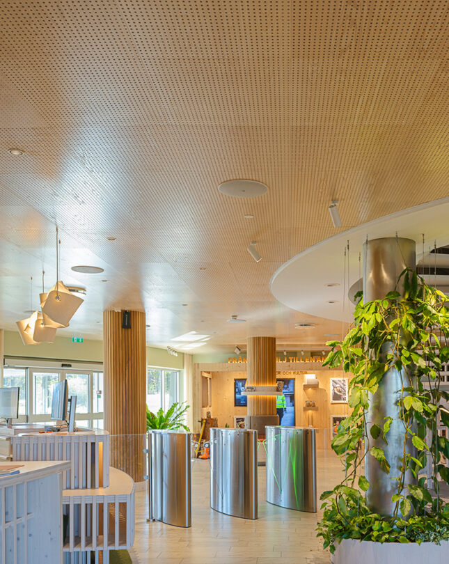The entrance area, with reception, elevators, and a large spiral staircase, as well as a coffee bar, shop, and exhibition area, is centrally located in the “waist” of the Y-shaped building. Acoustic panels from Gustafs have been installed throughout the entire 300 sqm hexagonal ceiling. Three different perforations have been used, and all panels are in white pigmented ash veneer.