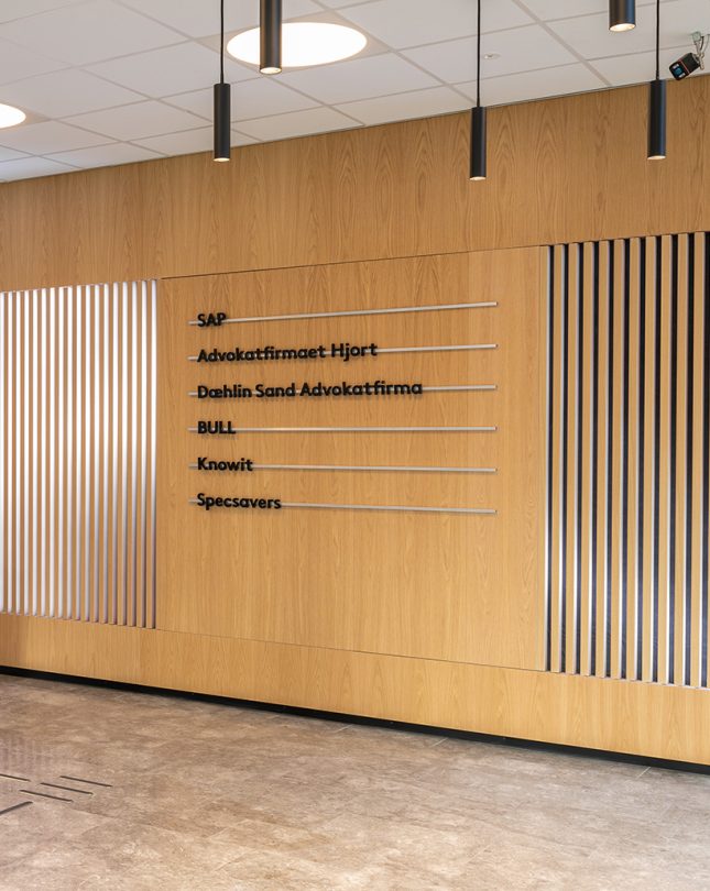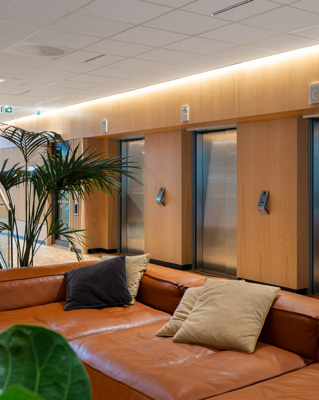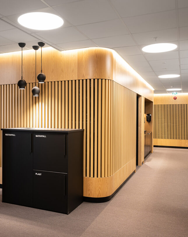The interior walls have been designed with rounded corners, to beautifully reflect the exterior of the building. Throughout the space, the walls are covered with 4,000 square metres of Gustafs panels in oak veneer, in a harmonious mix of plain panels and ribs.