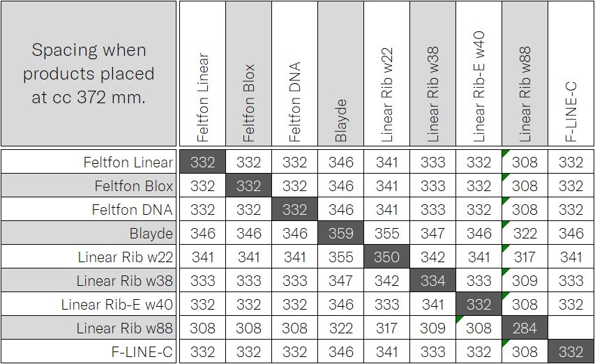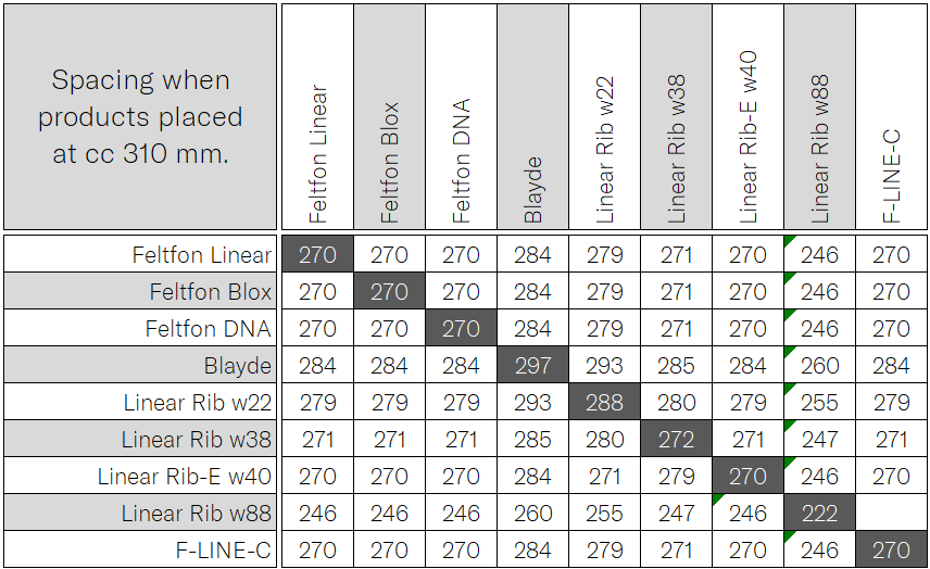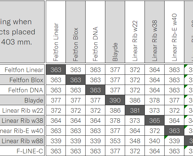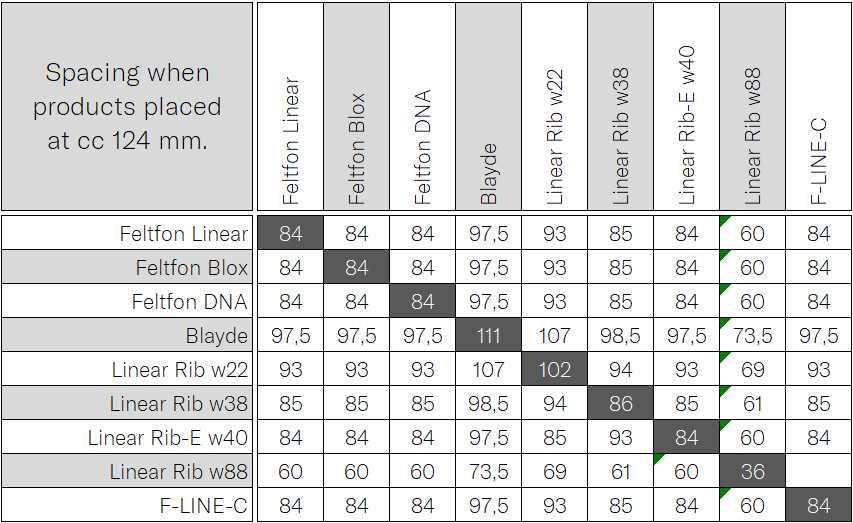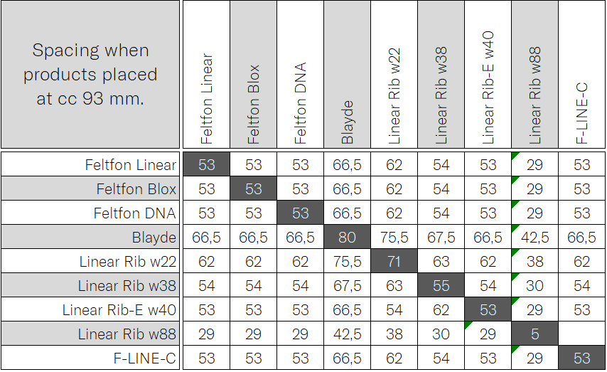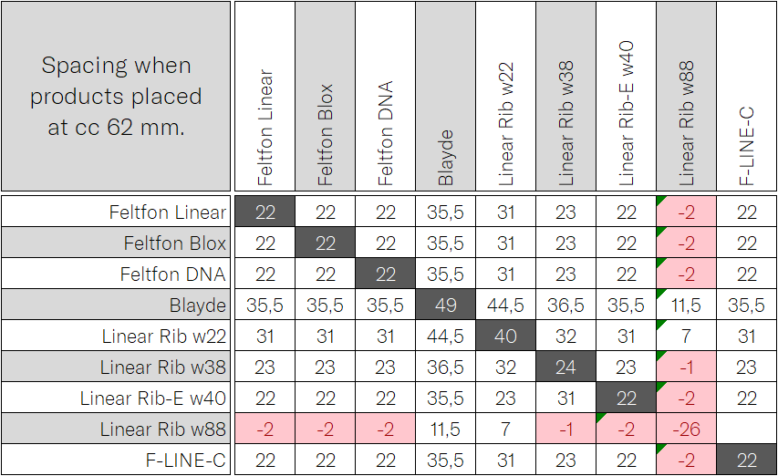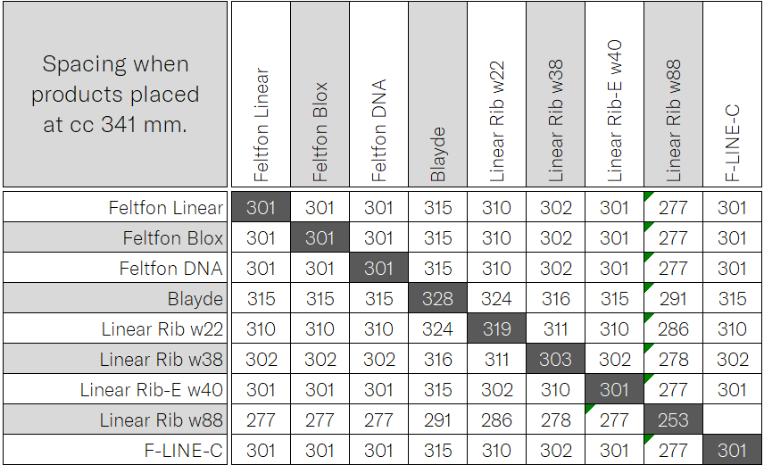 Integrerade F-line linjära LED-lampor kan placeras i systemet och ger en snygg linjerad ljuslösning. Capax MIX möjliggör även installation av både Feltfon akustiska bafflar och helfanérade Blayde-bafflar, vilket ger stor frihet att utforma galler- och baffeltak beroende på projektets akustiska och estetiska krav.