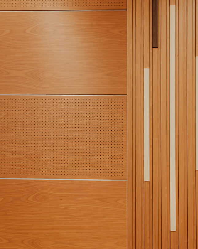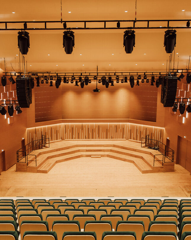 De två mindre amfiteatrarna är också klädda med Gustafspaneler, en i Gemini körsbärsfanér och den andra i Gemini björkfanér.